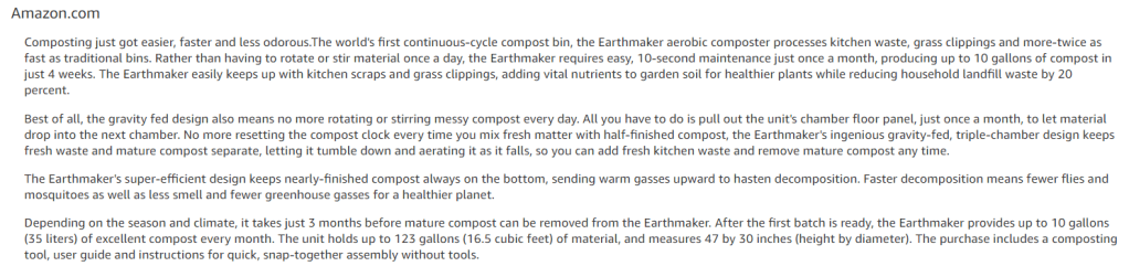 October 15, 2009June 2, 2025briolson69 Amazon.com Product Description https://www.amazon.com/Earthmaker-EARTH-120-Gallon-Aerobic-Composter/dp/B001CEU5NK/ref=sr_1_2?ie=UTF8&s=hi&qid=1276469091&sr=8-2 Share this: Click to share on X (Opens in new window) X Click to share on Facebook (Opens in new window) Facebook Like Loading...