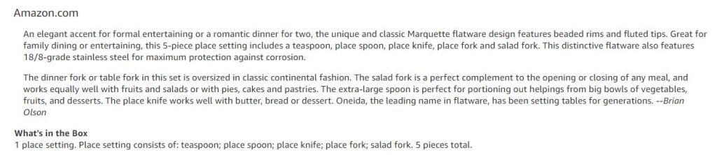 October 15, 2009June 2, 2025briolson69 Amazon.com product description https://www.amazon.com/Oneida-Marquette-5-Piece-Flatware-Service/dp/B0000AZUP1 Share this: Click to share on X (Opens in new window) X Click to share on Facebook (Opens in new window) Facebook Like Loading...